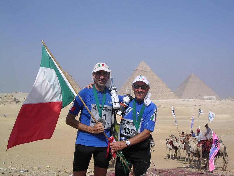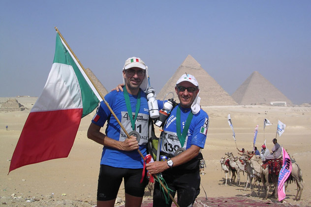 "Siamo alla parata finale, non conta per la classifica. Non vorrei neppure correrla ma alla fine arrivare sotto le Piramidi ha un grande fascino e poi la pizza dopo tanti liofilizzati è una “carota” troppo ghiotta. Dopo pochi minuti mi sento chiamare da dietro. E’ il mitico Dean Karnazes che mi dice arriviamo mano nella mano. Un grande onore per me. Arriviamo sotto lo striscione finale parlando del più e del meno e scopriamo che abbiamo fatto 3 km in più rispetto agli altri. E’ finita . Dedico tutto ancora al povero Beppe."