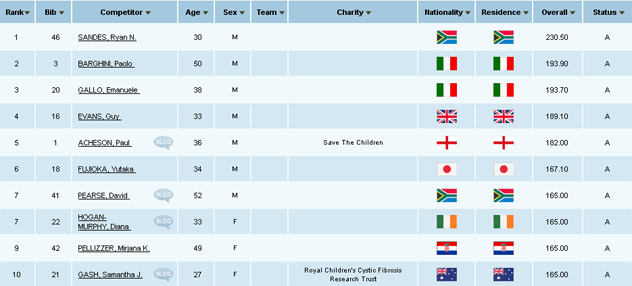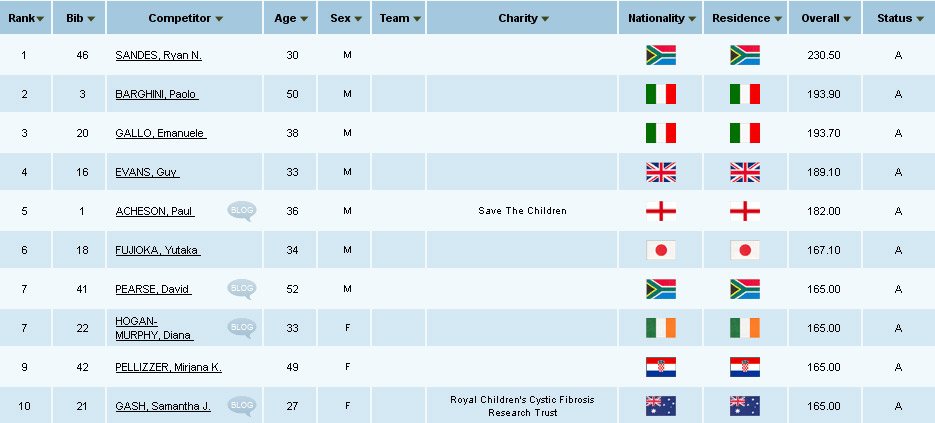 La tappa e l'intera gara è finita con la vittoria di Ryan Sandes. Non ci sono ancora i risultati degli altri concorrenti, si sa che sono tutti arrivati e ora sono tutti sulla nave. La quarta tappa era l'ultima di questa incredibile gara. Le tre donne che erano in testa nella classifica femminile sono arrivate tutte insieme tenendosi per mano. I giri della quarta tappa erano di 2,3 km l'uno.