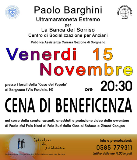 Cena di Beneficenza e Sport Estremo per La Banca del Sorriso, Centro di Socializzazione per Anziani, Pubblica Assistenza Carrara. Nel corso della serata racconti, aneddoti e proiezione video delle avventure di Paolo dal Polo Nord al Polo Sud dalla Cina al Sahara e Grand Canyon. Per Info e Contatti.
